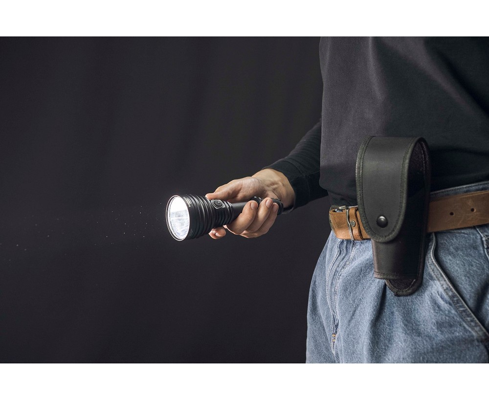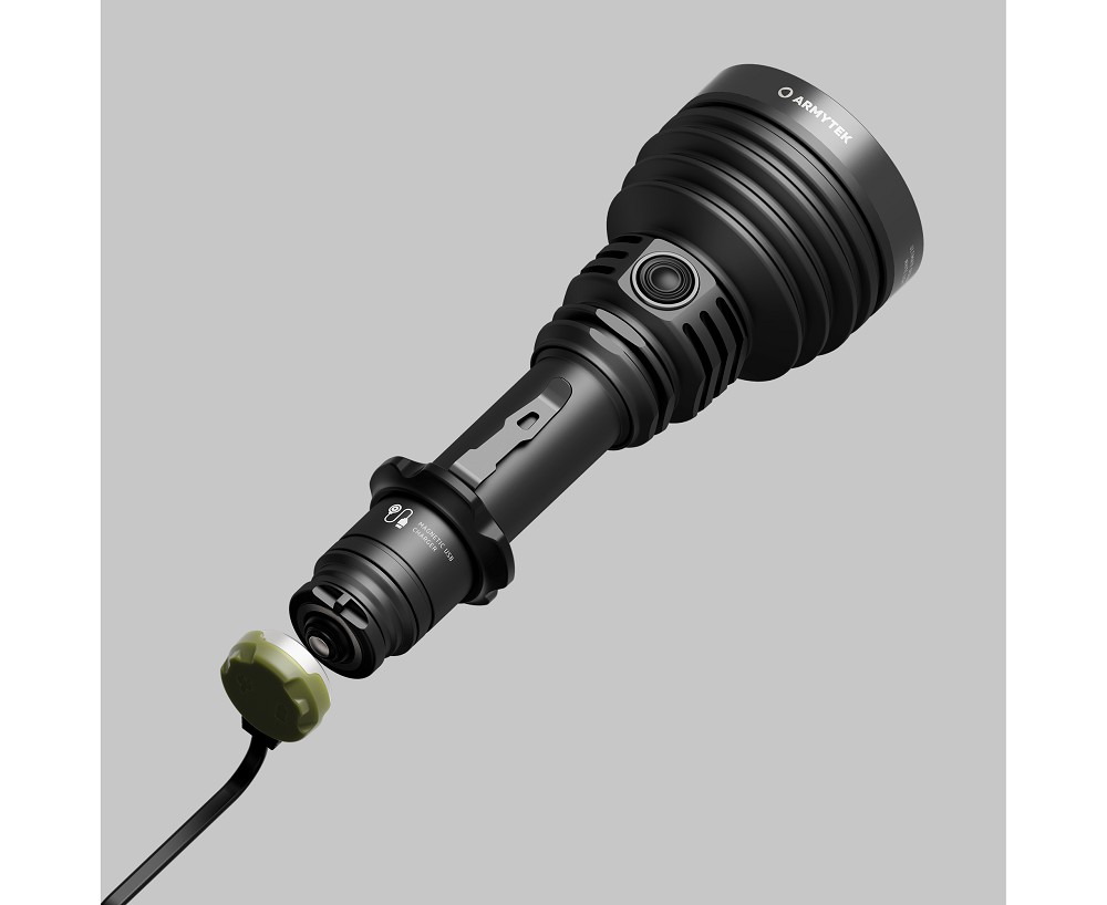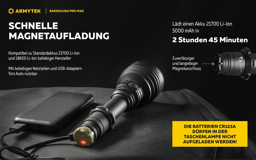 Die Taschenlampe bietet eine hohe Flexibilität bei der Stromversorgung und kann mit dem mitgelieferten 21700 Li-Ionen-Akku mit 5000 mAh, einem 18650 Akku oder alternativ mit zwei CR123A Batterien betrieben werden. Dadurch eignet sie sich auch für längere Einsätze fernab von Lademöglichkeiten. Die magnetische Schnellladefunktion ermöglicht ein vollständiges Aufladen in kurzer Zeit, während intelligente Elektronik und ein aktiver Überhitzungsschutz bei etwa +58 °C für maximale Sicherheit sorgen. Zwei verstärkte Federn schützen Akku und Elektronik zusätzlich vor Stößen und Rückstoßbelastungen, wodurch die Lampe auch für den taktischen Einsatz geeignet ist.