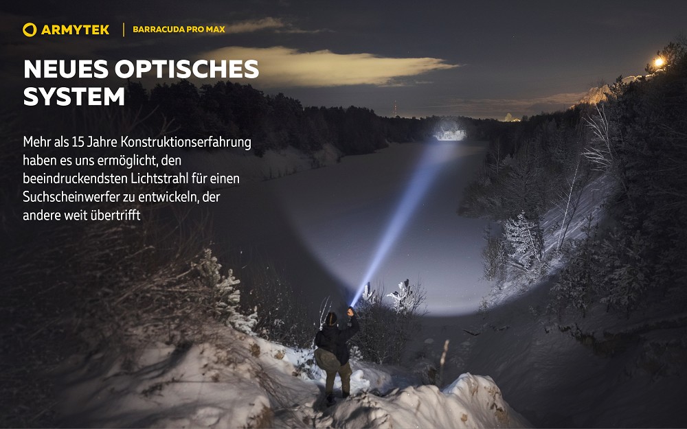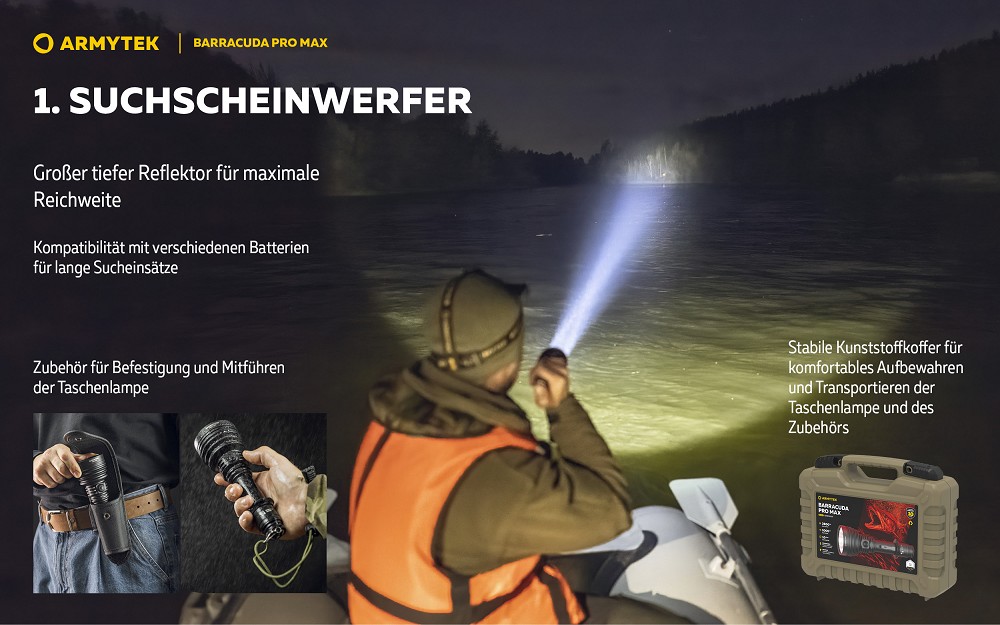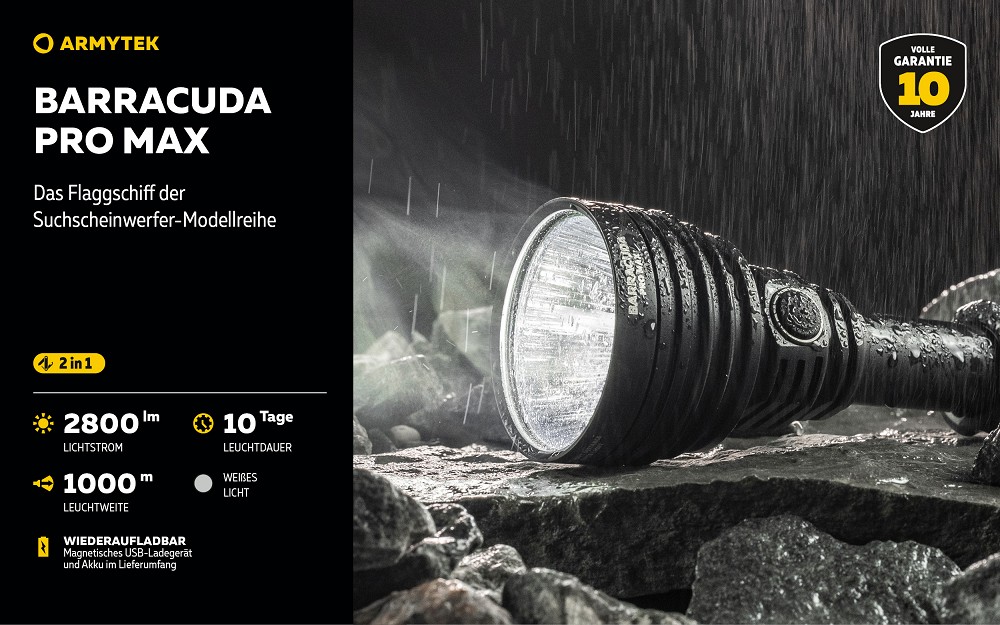 Die Barracuda Pro Max ist das Flaggschiff der Suchscheinwerfer-Modellreihe und vereint über 15 Jahre Entwicklungserfahrung in einer leistungsstarken Taschenlampe, die speziell für extreme Reichweiten und professionelle Sucheinsätze konzipiert wurde. Mit einer Lichtleistung von 2800 Lumen und einer beeindruckenden Reichweite von bis zu 1000 Metern setzt sie neue Maßstäbe in ihrer Klasse. Der fokussierte Lichtstrahl mit klar definiertem zentralem Lichtkegel ermöglicht die gezielte Ausleuchtung weit entfernter Objekte und macht die Lampe ideal für Rettungseinsätze, Geländeerkundung oder taktische Anwendungen. Trotz dieser enormen Leistung bleibt die Konstruktion ergonomisch und vergleichsweise leicht, da die hohe Lichtausbeute durch eine einzelne Hochleistungsdiode erzeugt wird und auf zusätzliche optische Komponenten verzichtet werden kann.