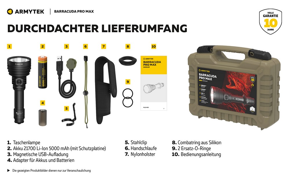 Das Gehäuse besteht aus robustem Flugzeugaluminium mit einer widerstandsfähigen, mattierten Oberfläche und ist für extreme Bedingungen ausgelegt. Die Barracuda Pro Max ist nach IP68 vollständig gegen Wasser, Staub und Schmutz geschützt und funktioniert selbst nach dem Eintauchen in bis zu 25 Meter Tiefe. Sie übersteht zudem Stürze aus großer Höhe und bietet durch die integrierte Stahllünette zusätzlichen Schutz für das optische System. Dank der Kompatibilität mit Fernschaltern und Unterlaufhalterungen lässt sich die Lampe flexibel erweitern und auch als taktische Ausrüstung einsetzen. Der umfangreiche Lieferumfang mit Holster, Clip, Handschlaufe und ergonomischem Silikon-Combatring sorgt für vielseitige Tragemöglichkeiten und hohen Komfort im Einsatz. Die Barracuda Pro Max ist damit eine kompromisslose Lösung für Anwender, die maximale Reichweite, Zuverlässigkeit und Vielseitigkeit in einer professionellen Taschenlampe suchen.