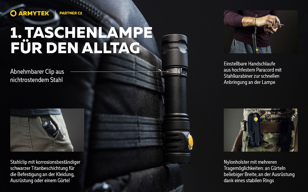 Die Partner C2 ist ein vielseitiger Begleiter im Alltag, sei es im Haushalt, bei Outdoor-Aktivitäten oder beim Angeln, und kann sogar größere taktische Lampen ersetzen. Sie verfügt über ein robustes Gehäuse aus Flugzeugaluminium mit mattierter Oberfläche, das eine angenehme Haptik ohne scharfe Kanten bietet. Das mitgelieferte Nylonholster ermöglicht die Befestigung an Gürtel, MOLLE-Halterungen oder Ausrüstung, während der abnehmbare Clip aus Stahl und die Handschlaufe aus Paracord weitere praktische Tragemöglichkeiten bieten. Der integrierte Magnet im hinteren Deckel erlaubt die Anbringung der Lampe auf metallischen Oberflächen, und sie ist kompatibel mit optionalem Zubehör wie Unterlaufhalterungen und Farbfiltern, wodurch sie auch für taktische Einsätze geeignet ist.