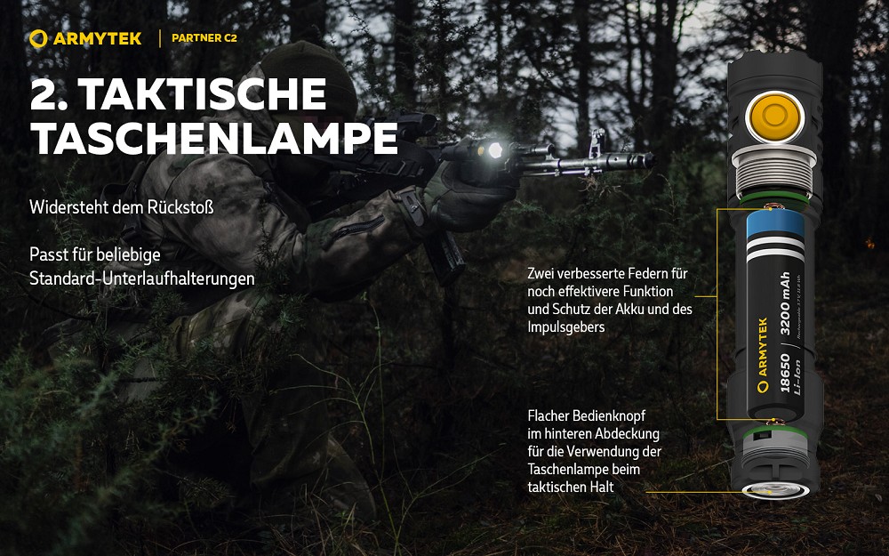 Die elektronische Ausstattung der Partner C2 kombiniert hohe Lichtleistung mit langer Leuchtdauer. Der mitgelieferte 18650 Li-Ionen-Akku mit 3200 mAh wird über den magnetischen Schnellladeanschluss in etwa 3 Stunden und 20 Minuten aufgeladen. Fünf voreingestellte Betriebsarten lassen sich bequem über den seitlichen Knopf steuern, während der taktische Knopf für schnelle Eingriffe im Einsatz bereitsteht. Ein aktiver Schutz vor Überhitzung sorgt dafür, dass die Helligkeit bei Annäherung an +58 °C reduziert wird, um Lampe, Akku und LED zu schützen. Die Partner C2 ist kompatibel mit einem Standard-18650-Akku oder zwei CR123A-Batterien, die ebenfalls eingesetzt werden können, und verfügt über vollständigen Kurzschlussschutz.
