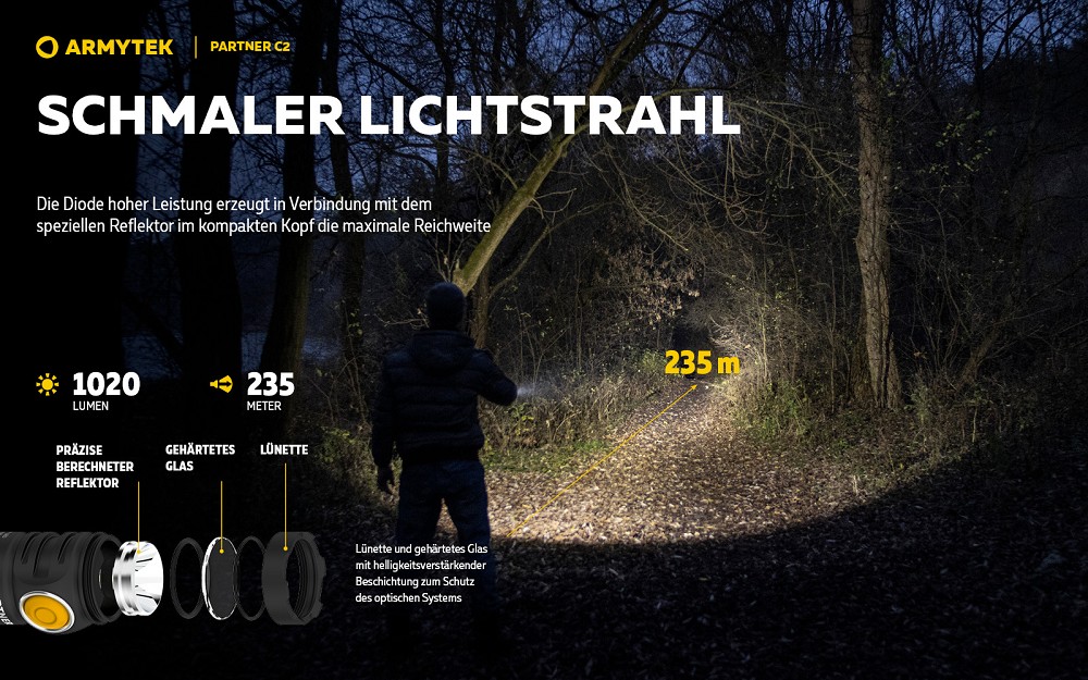 Das präzise berechnete optische System im kompakten Lampenkopf erhöht die Leuchtweite im Vergleich zu Standard-LEDs um das 1,5-fache. Das gehärtete Glas mit helligkeitsverstärkender Beschichtung sorgt für maximale Reichweite. Zwei Federn schützen Akku und Impulsgeber, während die elektronische Steuerung langlebig, geräuscharm und zuverlässig ist. Die Lampe ist nach IP68 gegen Wasser, Staub und Schmutz geschützt, übersteht Stürze aus bis zu 10 Metern Höhe und kann bis zu fünf Meter unter Wasser betrieben werden. Farbige Anzeigen informieren über Temperatur und Batteriestatus und können bei Bedarf deaktiviert werden. Die Partner C2 vereint in einem kompakten, robusten Gehäuse höchste Leistung, Langlebigkeit und flexible Einsatzmöglichkeiten und ist sofort einsatzbereit.