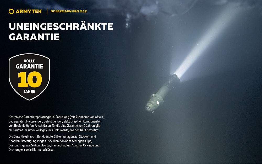 Mit ergonomischem Silikon-Combatring, Stahlclip, Nylonholster, Handschlaufe und wasserdichter Aufbewahrungsbox ist die Dobermann Pro Max sofort einsatzbereit und eignet sich für Outdoor-Enthusiasten, Jäger und taktische Anwender, die Wert auf Kompaktheit, Zuverlässigkeit und maximale Leistung legen.