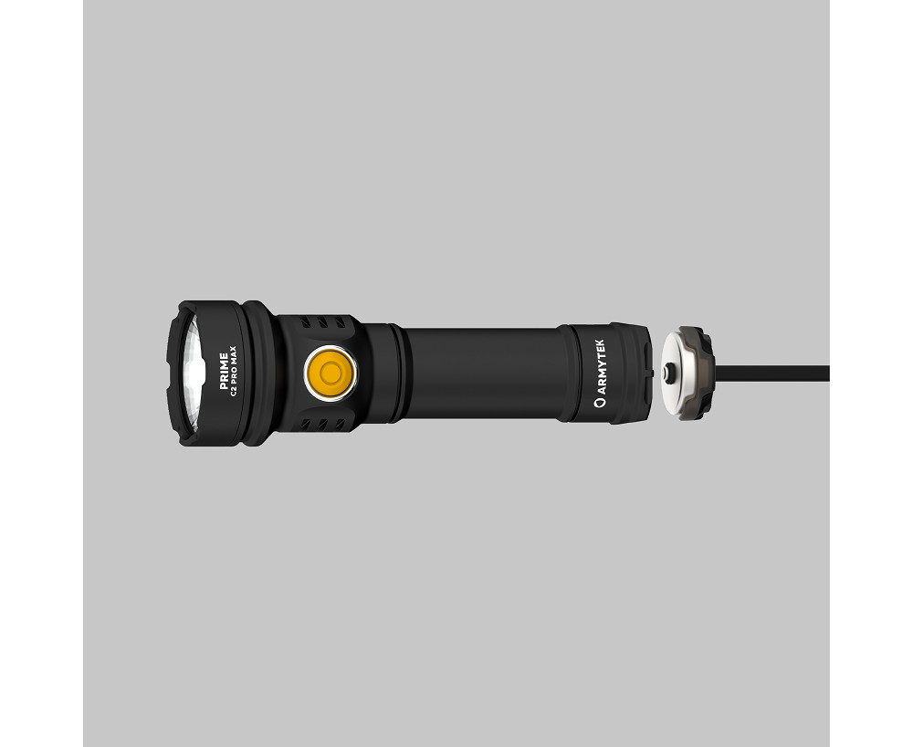 Die Prime C2 Pro Max wird standardmäßig mit einem 21700 Li-Ionen-Akku mit 5000 mAh geliefert und kann alternativ über Adapter mit einem 18650 Li-Ionen-Akku betrieben werden. Die Elektronik beinhaltet einen intelligenten Ladealgorithmus, Schutz vor Überhitzung, Kurzschluss und versehentlichem Einschalten. Der Akkustand wird farbig angezeigt, und ein niedriger Ladezustand wird zuverlässig signalisiert.