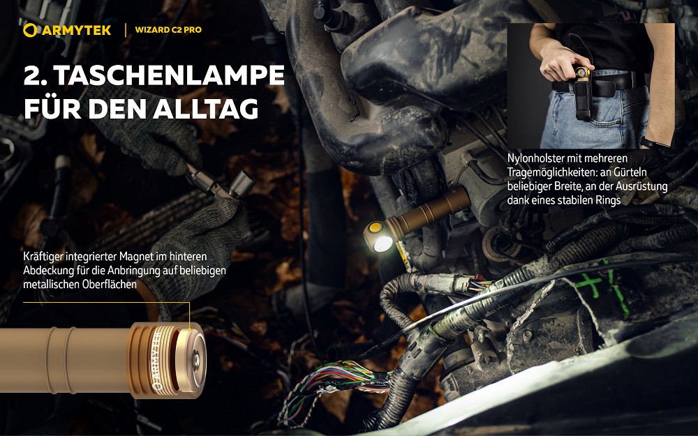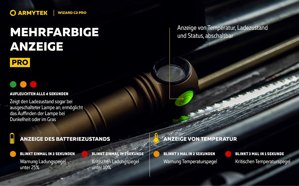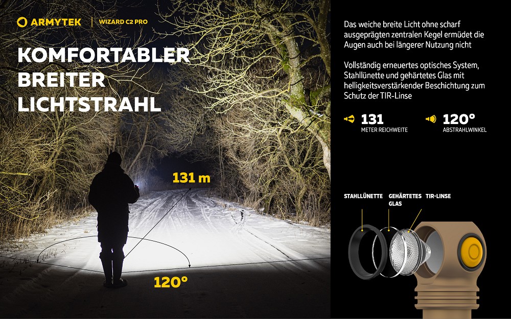 Dank moderner TIR-Optik erzeugt die Lampe ein besonders gleichmäßiges und breites Lichtbild mit einem zentralen Lichtkegel und großzügiger seitlicher Streuung. Die digitale Helligkeitsstabilisierung garantiert eine konstante Lichtleistung über die gesamte Laufzeit hinweg. Mit insgesamt 12 Leuchtmodi lässt sich die Wizard C2 Pro flexibel an jede Situation anpassen – von maximaler Helligkeit bis hin zu extrem energiesparenden Einstellungen mit bis zu 200 Tagen Laufzeit.
