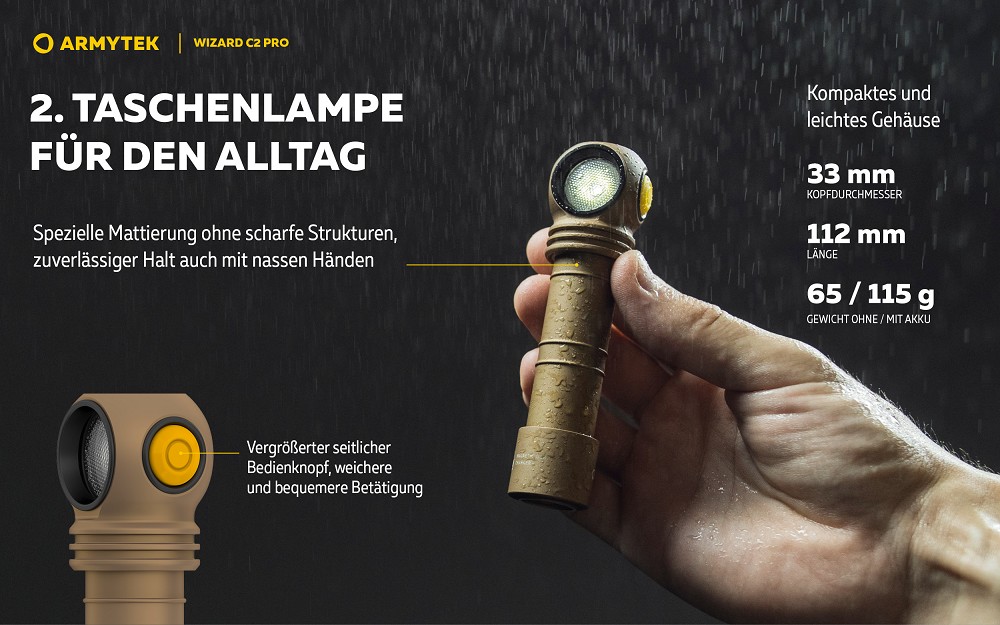 Die Armytek Wizard C2 Pro Magnet USB White in der Farbe Sand ist eine hochleistungsfähige Multifunktions-Taschenlampe, die für anspruchsvolle Outdoor-Einsätze, Handwerk und professionelle Anwendungen entwickelt wurde. Mit ihrer extrem starken Lichtleistung von bis zu 2500 Lumen liefert sie eine beeindruckende Ausleuchtung und eignet sich sowohl für den Nahbereich als auch für mittlere Distanzen. Das neutral-weiße Licht sorgt dabei für eine klare Sicht und eine realistische Farbwiedergabe.