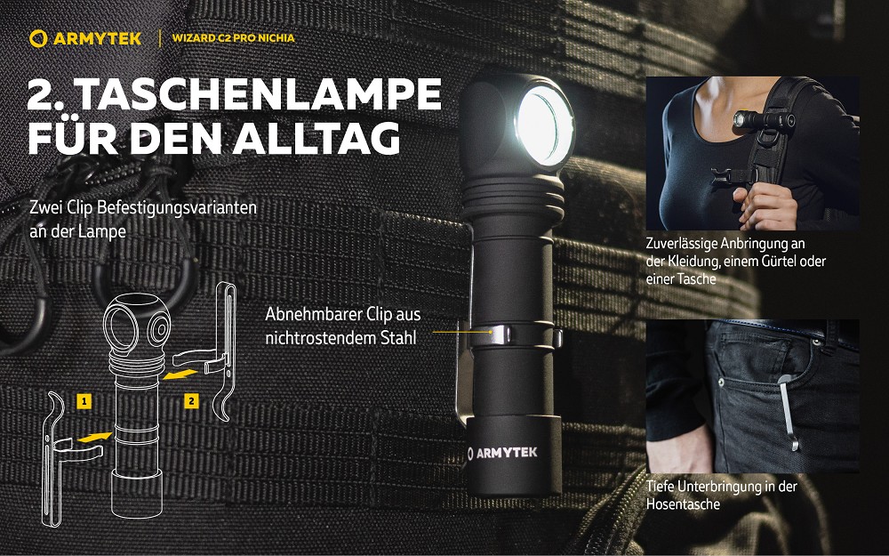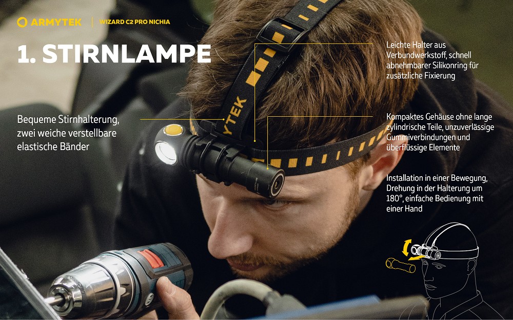 Die multifunktionale 3-in-1-Lampe eignet sich ideal für aktive Freizeitgestaltung, Sport, Angeln, Jagd, Arbeiten am Auto und auf Baustellen. Dank Stirnbandhalterung, Clip, Nylonholster und integriertem Magnet im hinteren Deckel lässt sich die Lampe flexibel einsetzen. Zudem ist sie kompatibel mit Helmhalterungen der Serie AHM für industrielle Einsätze und Alpinismus.