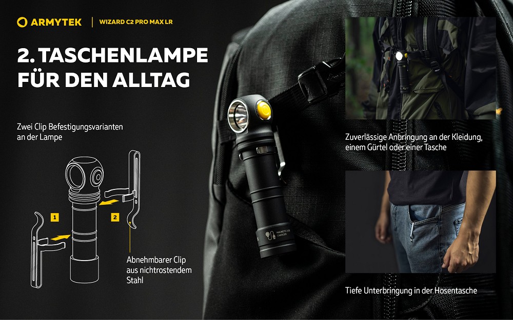 Die Taschenlampe kann wahlweise mit dem im Set enthaltenen 21700 Li-Ion-Akku oder über einen Adapter mit Standard-18650-Akkus betrieben werden. Verschiedene Befestigungsmöglichkeiten wie Stirnhalterung, Clip, Holster und der integrierte Magnet im hinteren Gehäuse ermöglichen eine flexible Nutzung im Alltag, beim Sport oder Outdoor-Aktivitäten. Für industrielle Einsätze und Alpinismus sind originale Helmhalterungen verfügbar.
