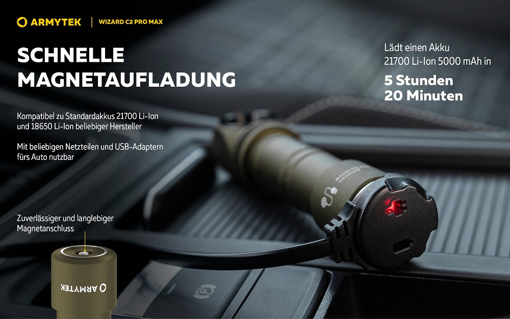 Mobile Preview: Armytek Wizard C2 Pro Max Magnet USB Olive Taschen- und Stirnlampe mit Magnethalterung / Stirnhalterung akkubetrieben weißes Licht