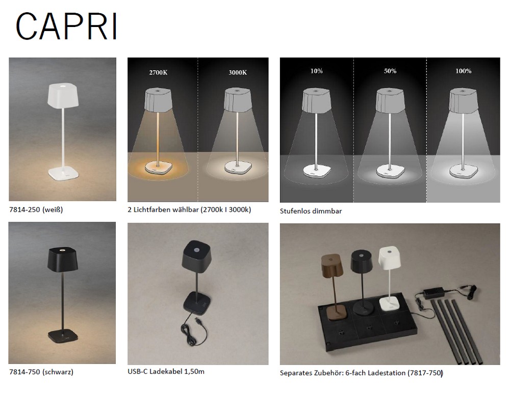 Egal, ob gemütlicher Leseabend im Wohnzimmer oder Sommernacht mit Freunden auf der Terrasse: Die in weiß edel wirkende wiederaufladbare CAPRI ist überall dabei. Ihr leistungsstarker Akku und die Einsatzmöglichkeiten im Innen- und Außenbereich machen sie unabhängig von Steckdosen – und damit zur perfekten Wahl für Spontane und Outdoorgenießer. Durch ihre hochwertige Verarbeitung und das solide Gewicht hält sie auch Windböhen stand, ohne gleich umzukippen. Ihr warmweißes Licht verströmt ein behagliches Ambiente und ist stufenlos dimmbar.