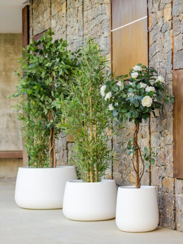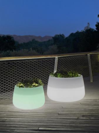 Dieser bauchige Pflanzkübel namens CAMELIA 60 ist beleuchtet und verfügt über einen wiederaufladbaren Akku. Er strahlt ein erfrischendes kaltweiß aus, was mit der weißen Topffarbe sehr gut harmoniert. CAMELIA ist ein Hingucker auch für Ihre Gäste, Freunde und Nachbarn. Aufgrund seines geringen Gewichtes ist dieser Topf einfach zu transportieren. Bunte Blumen oder prächtige Solitätpflanzen bilden einen gelungenen Kontrast zu dem Weiß und der tageslichtweissen Lichtfarbe des Kübels. Features: In & Out-Finish, dimmbares Licht, RGBW, Aufladung per USB-Anschluß oder Solar und Fernbedienung.