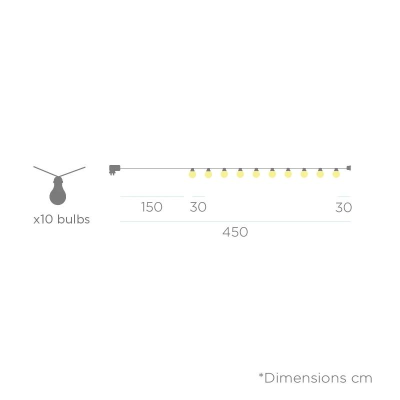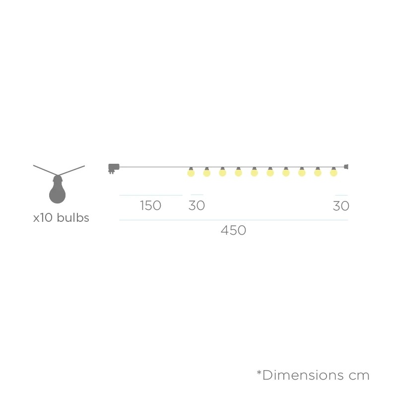 Solarkollektor mit Litum Akku für die Lichterkette Stella Guirnalda. Die Lichterkettenlänge beträgt 4,5 Meter und kann aufgrund des IP44-Schutzes im Außen- und Innenbereich verwendet werden und hat 10 Glühbirnen. Der Akku wird über ein Solarpanel aufgeladen.