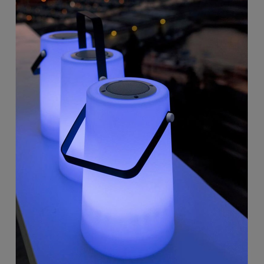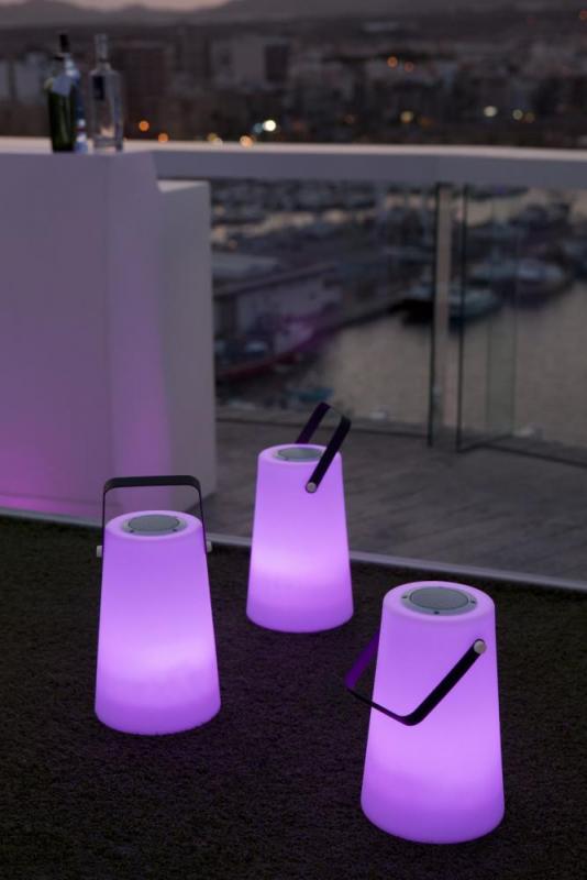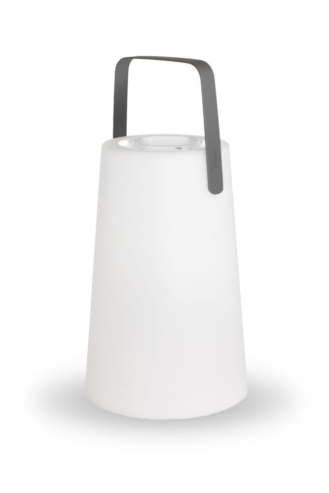 Die NOMAD Tischlampe ist eine konisch geformte tragbare LED-Leuchte, deren Größe und Leichtigkeit vom spanischen Lebensgefühl inspiriert ist und bringt daher ein wenig Mittelmeeratmosphäre mit sich. Dieser tragbare Lautsprecher mit ø19 x 30 cm ist ideal fürs Heim, den Garten oder die Terrasse. Die NOMAD Bluetooth-Lautsprecherlampe ist eine Lampe mit RGB-Beleuchtung, die sich auch hervorragend für Partys oder gesellige Abende auf der Terrasse eignet. Diesen tragbaren beleuchteten Lautsprecher können Sie überall hin transportieren. Auch geeignet als Lichtquelle und Musikbox für Champingausflüge oder für den Urlaub in einem Ferienhaus.