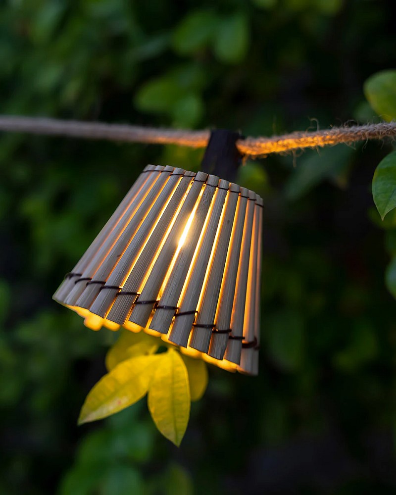 Die Outdoor-Girlande OKINAWA ist handgefertigt aus Bambus. Sie verfügt über 10 glockenförmige Lampenschirme mit organischem Design und 10 austauschbaren Glühbirnen. Kombinierbar ist sie mit weiteren Produkten der Okinawa-Serie wie der Laterne (Okinawa Lantern), der Hängeleuchte (Okinawa 40 Hang) oder der herausragenden Stehleuchte Okinawa 170. Sie alle bilden ein Lampenset, das Ihrem Garten einen Hauch harmonischer Natur verleiht. Zehn Glühbirnen und zwei Ersatzbirnen sind im Lieferumfang enthalten. Das Seil hat eine Jute-Effekt-Oberfläche und ist 8 Meter lang.