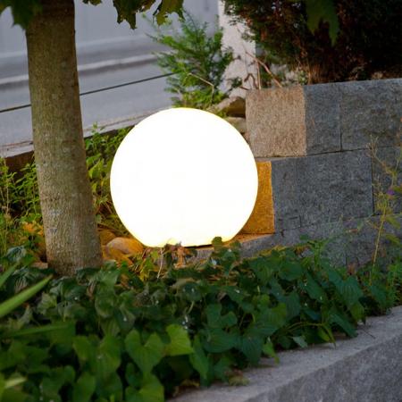 Dekorative Kugelleuchte für den Außenbereich aus Kunststoff mit weißer Oberfläche. Dank der E-27 Fassung können sowohl LED-Leuchtmittel bis max. 10W, als auch Energiesparleuchtmittel bis max. 25W eingesetzt werden. Je nach verwendetem Leuchtmittel lassen sich die unterschiedlichsten Effekte erzielen. Ganz besonders geeignet, dank der weißen Farbgebung, sind hierfür RGB-Leuchtmittel. Da die Kugelleuchte noch in fünf weiteren Größen erhältlich ist, lassen sich auch kleine Gruppen der Leuchten als absoluter Blickfang zusammen platzieren. Dank des im Lieferumfang enthaltenen Erdspieß hat die Kugel jederzeit einen sicheren Stand. Um die Leuchte z. B. beim Rasenmähen leichter versetzten zu können, empfiehlt es sich, zuvor die separat erhältliche Einschlaghülse (ESH360) in den Boden einzubringen. Die 1,8m lange Anschlussleitung ist mit einem Konturenstecker versehen. Dank der UV- und Temperaturbeständigkeit (-65°C - 85°C) kann die Leuchte ganzjährig im Außenbereich verbleiben.