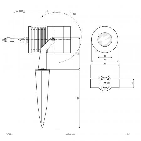 Die Leuchte kann entweder mittels des montierten Bügels direkt auf dem Untergrund, oder optional mit dem mitgeliefertem Erdspieß im weichen Untergrund montiert werden. Am Strahler befindet sich eine 3m lange Anschlussleitung mit Stecker für das IP44-Stecksystem. Die Kabeleinführung in die Leuchte erfolgt durch eine Kabelverschraubung. Dank der Vorbereitung für das Stecksystem, können problemlos auch größere Anlagen schnell und einfach installiert werden. Mit montiertem Erdspieß hat die Leuchte einen Drehbereich von 90°. Der Schwenkwinkel der Leuchte beträgt 45°. Der Erdspieß hat eine Länge von 170mm.
