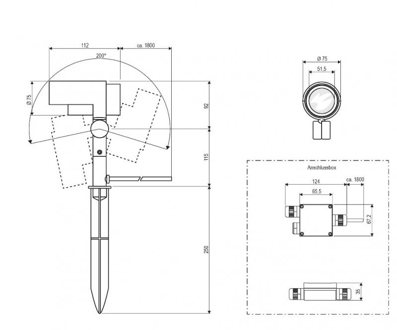 Der LED-Gartenspot, welcher mit einem Hochvolt-LED-Chip bestückt ist, wird mit dem mitgeliefertem Erdspieß direkt im weichen Untergrund montiert. Am Strahler befindet sich eine 1,8m lange Anschlussleitung mit Anschlussbox. Die Leuchte kann +/- 100° geschwenkt und um 340° gedreht werden. Der Erdspieß hat eine Länge von 250mm.