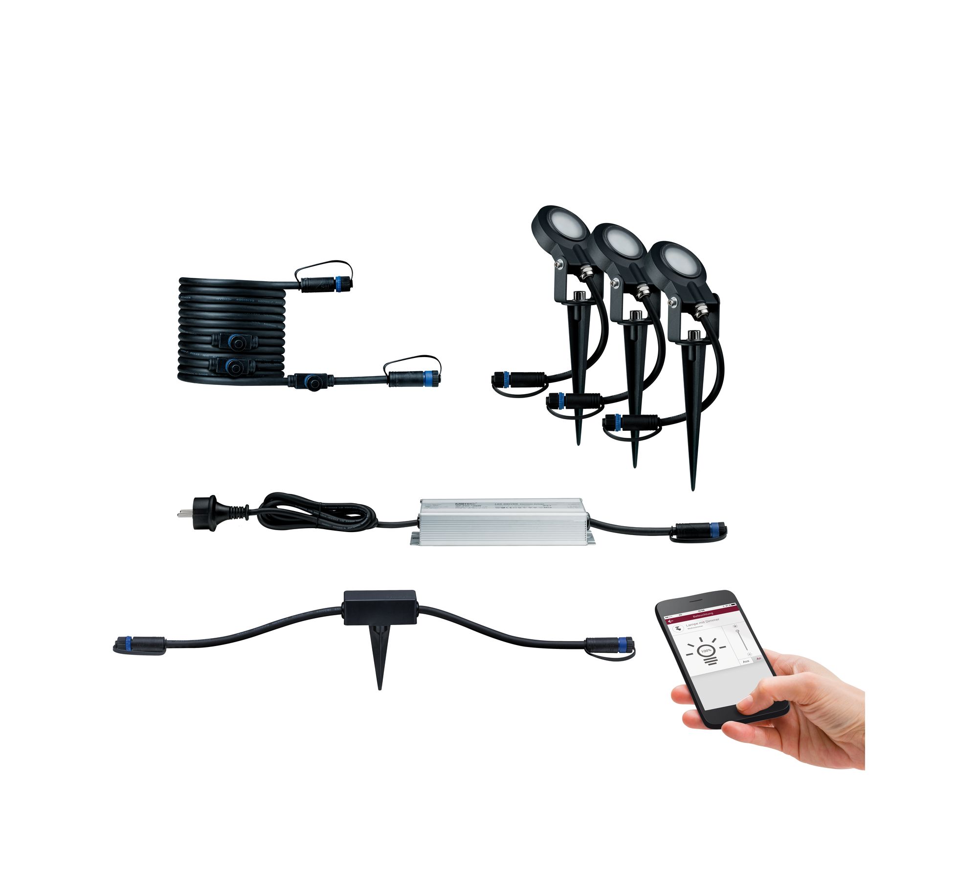 - Plug & Shine Basisset bestehend aus 3 Leuchten, 5 Meter Kabel mit 4 Ausgängen und Trafo