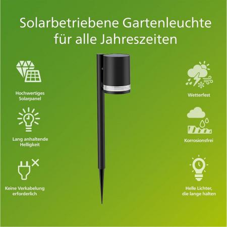Der Philips Jivix Spot ist eine zuverlässige Solarleuchte mit einer längeren Nutzlebensdauer. Sie senkt den Energieverbrauch und ist ein Beitrag zur Nachhaltigkeit. Die Solar Sockelleuchte mit Erdspiess besticht durch ein hocheffizientes Solarpanel und integriertem Tageslichtsensor. Dadurch kann die Leuchte auch bei wenig Sonnenschein genügend Energie speichern, um bis zu 8 Stunden ausreichend Helligkeit zu spenden.