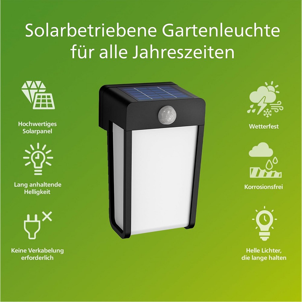 Die Philips Shroud Wandleuchte ist eine zuverlässige Solarleuchte mit einer längeren Nutzlebensdauer. Sie senkt den Energieverbrauch und ist ein Beitrag zur Nachhaltigkeit. Die Solar Wandleuchte Shroud in matter Optik besticht durch ein hocheffizientes Solarpanel und integriertem Tageslicht- und Bewegungssensor. Dadurch kann die Leuchte auch bei wenig Sonnenschein genügend Energie speichern, um bis zu 10 Stunden ausreichend Helligkeit zu spenden.