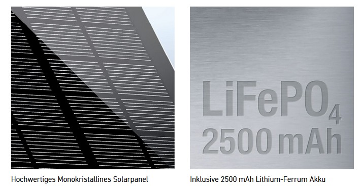 | Spannung | Solar, netzunabhängig, Lithium-Ferrum-Akku 2500 mAh |