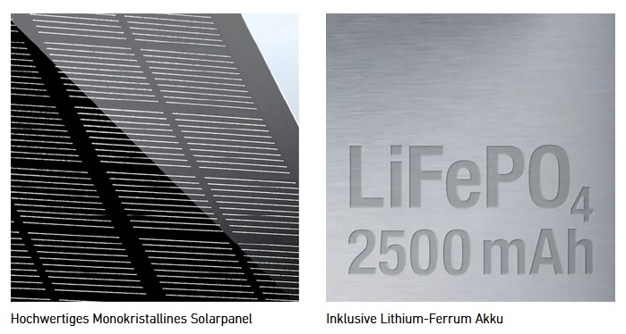 | Spannung | Solar, netzunabhängig, Lithium-Ferrum-Akku 2000 mAh |