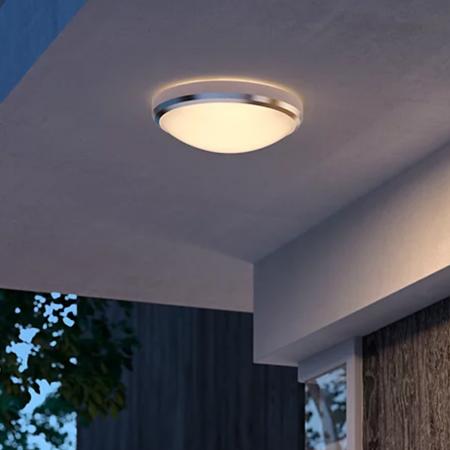 Die Philips LED-Deckenleuchte für den Außenbereich in Silber - Nickel ist aus langlebigem Metall/ Kunststoff gefertigt, sodass Sie sicher sein können, dass sie bei Wind und Wetter nicht rostet oder korrodiert. Das Design maximiert die Lichtverteilung für ausreichend diffuses und angenehmes warmweißes Licht. Dank der satinierten Oberfläche der Leuchte gibt die Deckenleuchte ein blendfreies Licht ab - perfekt für die Beleuchtung Ihres Außenbereichs.