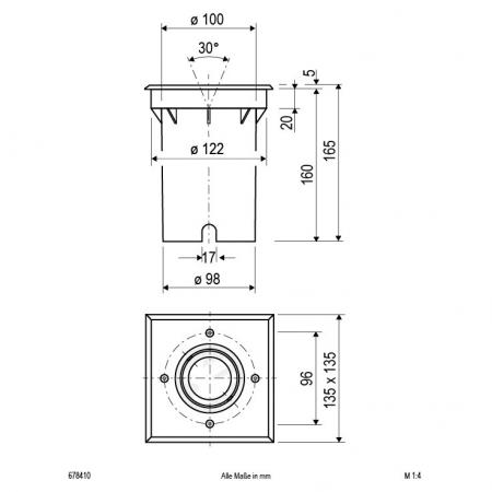 Die aus V2A-Edelstahl gefertigte Abdeckplatte sitzt auf einem Aluminium Leuchtengehäuse, welche zum Schutz vor Korrosion mit Polyester überzogen ist. Die durch eine Kabelverschraubung geführte Zuleitung hat eine Länge von 100cm. Durch die GU10 Hochvoltfassung können unterschiedliche Leuchtmittel bis max. 35W in der Leuchte betrieben werden. Die maximale Überfahrgeschwindigkeit beträgt 20km/h. Die Leuchtmittelhalterung ist drehbar in der Leuchte gelagert und besitzt einen Schwenkwinkel von 15°.