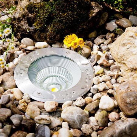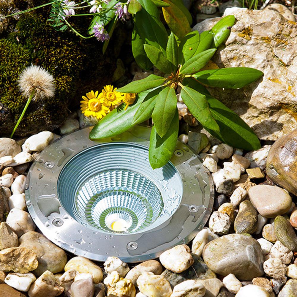 Der Leuchtenkörper der Bodeneinbauleuchte ist aus massivem Aluminium gefertigt, der obere Abdeckring hingegen aus V2A-Edelstahl und kann für vielfältige Anwendungen im Außenbereich verwendet werden. Die Montage erfolgt mittels der im Lieferumfang befindlichen Kunststoff-Einbauhülse. Da der COB-LED-Chip fest verbaut ist, fallen keine zusätzlichen Kosten für Leuchtmittel an. Ebenso entstehen auch keine zusätzlichen Kosten für ein Vorschaltgerät, da der Anschluss direkt an die 230V-Zuleitung erfolgt. Die maximale Überfahrgeschwindigkeit beträgt 20km/h. Optional sind für die Leuchte ein mattes Glas, sowie ein Blendschutz erhältlich.