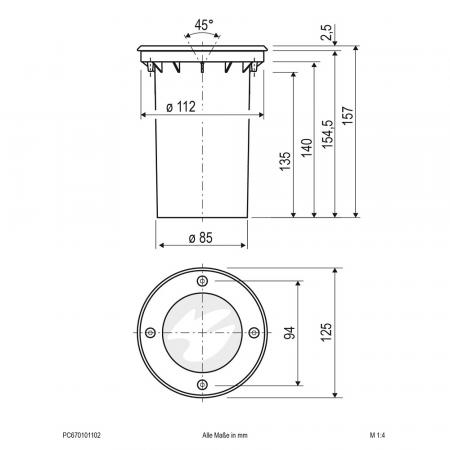 Der Leuchtenkörper der Bodeneinbauleuchte ist aus massivem Aluminium gefertigt, der obere Abdeckring hingegen aus V4A-Edelstahl und kann für vielfältige Anwendungen im Außenbereich verwendet werden. Die Montage erfolgt mittels der im Lieferumfang befindlichen Kunststoff-Einbauhülse. Der angegebene Lochausschnitt bezieht sich auf den oberen Teil der Einbauhülse, welcher sich, nach einem Versatz von 20mm, auf 88mm reduziert. Da der COB-LED-Chip fest verbaut ist, fallen keine zusätzlichen Kosten für Leuchtmittel an. Ebenso entstehen auch keine zusätzlichen Kosten für ein Vorschaltgerät, da der Anschluss direkt an die 230V-Zuleitung erfolgt. Die maximale Überfahrgeschwindigkeit beträgt 20km/h.