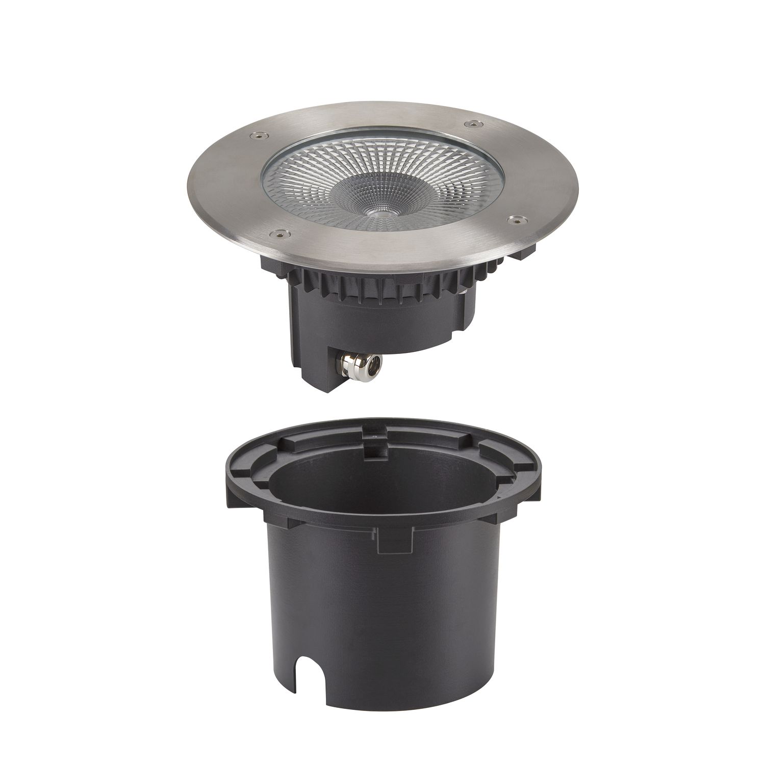 Die Bodeneinbauleuchte ROCCI 200 mit eckiger bzw. runder Edelstahlblende und klarer Glasabdeckung ist mit einem LED Modul ausgestattet. Durch die Schutzart IP67 ist die mit zwei Blendenformen verfügbare Leuchte für den Außenbereich geeignet. Der elektrische Anschluss erfolgt direkt an 230V Netzspannung. Zur einfachen Montage befindet sich ein Einbautopf im Lieferumfang.