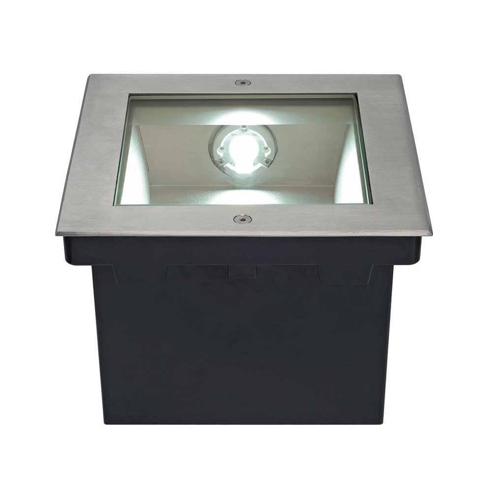 Die Hochvolt LED Bodeneinbauleuchte DASAR 225 mit quadratischer Edelstahlblende und teilsatinierter Glasabdeckung ist mit einem Hochleistungs LED Modul des Herstellers Philips ausgestattet. Durch die Schutzart IP67 und den indirekten Lichtaustritt ist Leuchte für Außenanwendung geeignet. Der elektrische Anschluss erfolgt durch den verbauten Treiber direkt an 230V Netzspannung. Zur einfachen Montage befindet sich ein Einbautopf im Lieferumfang.
