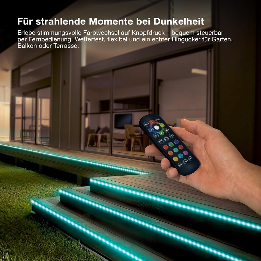 Bringen Sie farbenfrohes Licht in Garten, Terrasse oder andere Bereiche! Das helle, robuste LED-Band ist bis zu 50 Meter erweiterbar und dank IP65-Schutz ideal für den Außenbereich geeignet. Mit RGB-Farbsteuerung per Fernbedienung können Sie jederzeit die passende Stimmung wählen. Die Kabeltrommel sorgt für einfache Aufbewahrung, Montagezubehör und Batterie sind inklusive.