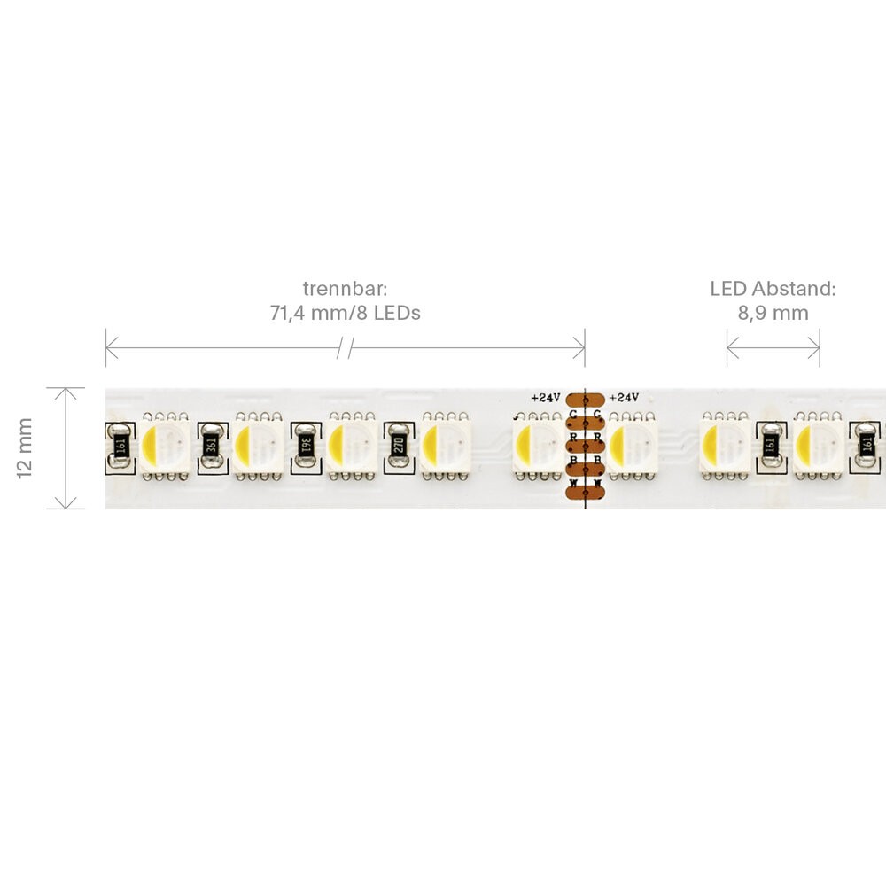 Unsere 14,4W RGB IP67 24V Streifen setzt Licht- und Farbstimmungen im Objekt um. Zu verschiedenen Zeitpunkten setzen Sie mit dem Band verschiedene Lichtfarben in Szene. Die Lichtfarbe lässt sich im RGB Spectrum verschieben.
