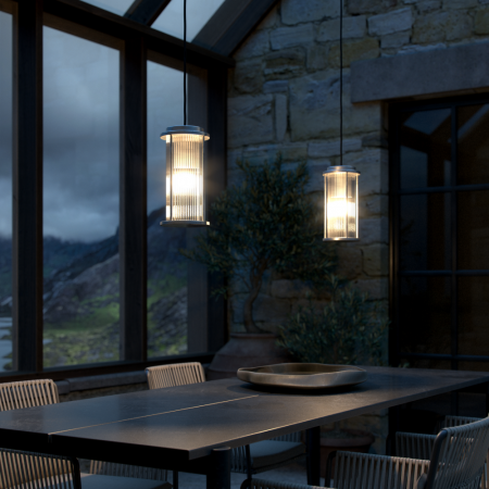Die Linton-Serie des dänischen Designerduos Says Who bietet ein rundes und elegantes Design – mit starker Referenz zu einer klassischen Laterne. Der geriffelt ausgeführte Diffusor sorgt für ein behagliches, indirektes Licht, und der Lampenfuß aus verzinktem Stahl eignet sich auch gut für raue Wetterbedingungen. Die Pendelleuchte ist wasserresistent und schafft das perfekte Ambiente für Ihre Außenbereiche. Sehr einfache Installation mit mitgelieferter Deckenkappe.