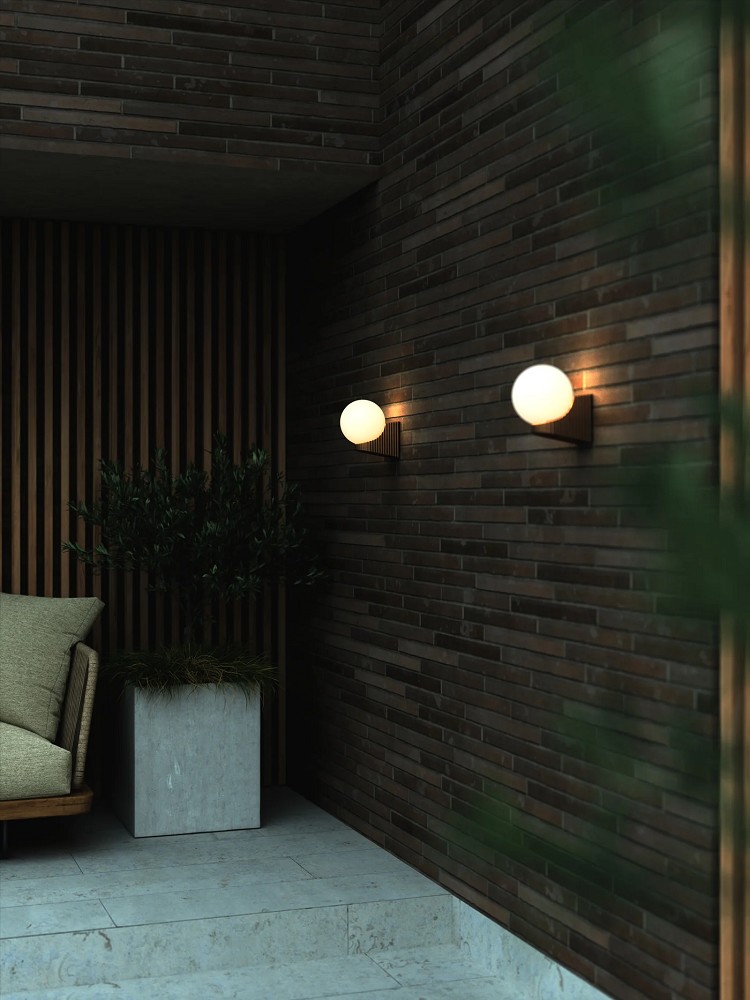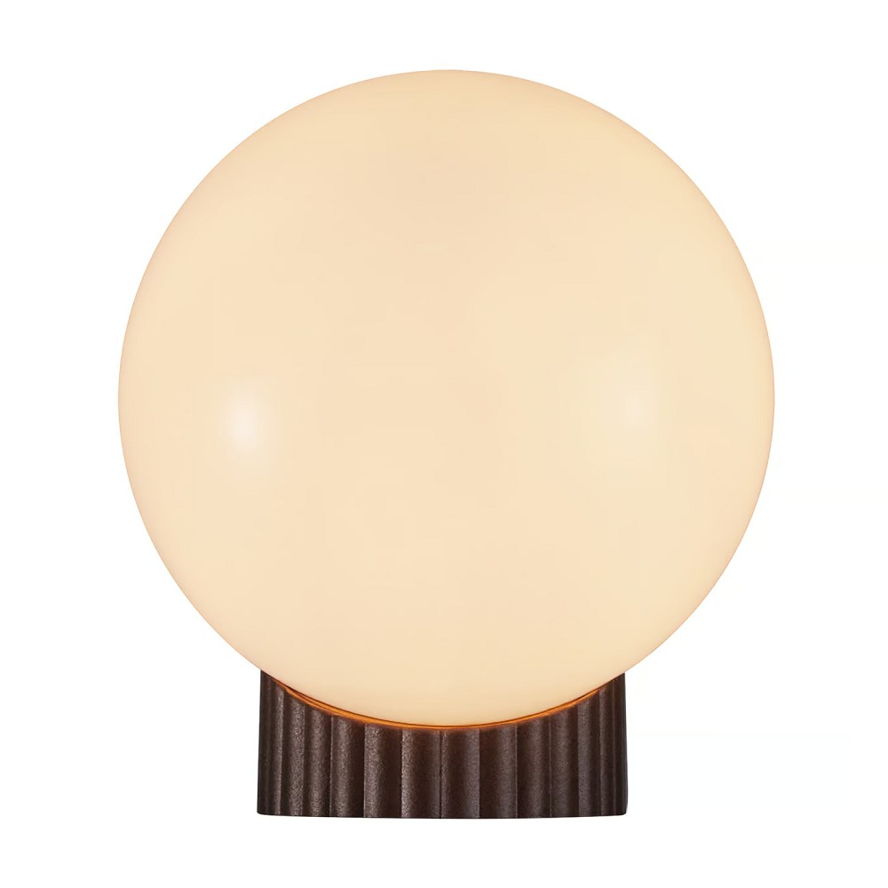Die Wandleuchte Hayley des dänischen Designduos Says Who verbindet klare Art-déco-Referenzen mit einer modernen Note. Der Sockel der Leuchte aus braunem Metall hat eine elegant geriffelte Oberfläche. Die glänzende Glaskuppel sorgt für ein angenehmes, diffuses Licht.