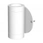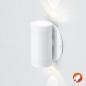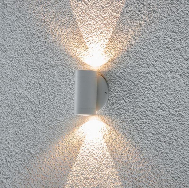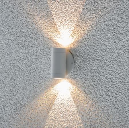 LED-Wandanbauleuchte für vielfältige Anwendungen im Innenbereich. Die Leuchte besteht aus einer Montageplatte und der zweiflammigen Leuchte. Oben und Unten wurde in die Lichtaustrittsöffnungen jeweils eine optische Linse eingelassen, durch welche das Licht gebündelt wird. Durch die dadurch entstehenden Lichtkegel schaffen Sie ein absolutes Highlight in jedem Raum. Die angegebenen Lumen werden natürlich je LED-Chip erreicht. Die Einzelmaße sind wie folgt: Durchmesser Montageplatte: 74mm und die Tiefe der Leuchte 50mm. Die Leuchte kann auch auf Schalterdosen montiert werden. Da die beiden LED-Chips nicht einzeln an das Vorschaltgerät angeschlossen werden können, muss bei der Wahl dessen die Gesamtleistung je Leuchte von 4W berücksichtigt werden. Die Leuchte verfügt über eine 0,1m lange Anschlussleitung.