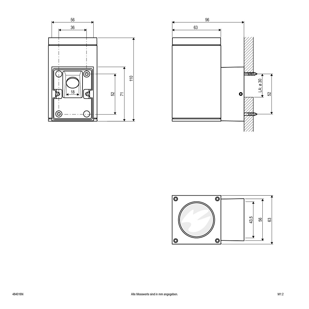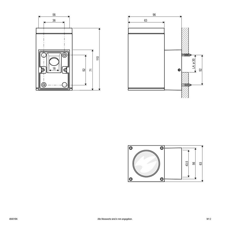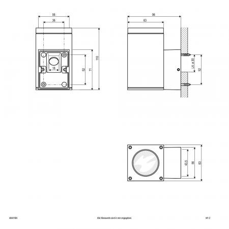 Massive Wandleuchte für den Außenbereich. Die Montage ist sowohl als Up-, als auch downlight möglich. Auch bei der Wahl des Leuchtmittels sind auf Grund der Hochvoltfassungen nahezu keine Grenzen gesetzt, jedoch dürfen nur Leuchtmittel bis max. 11W verwendet werden. Sockelmaß: 71mm x 56mm, Tiefe: 33mm, die angegebene Tiefe ist inkl. Sockel gemessen.