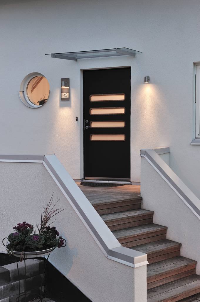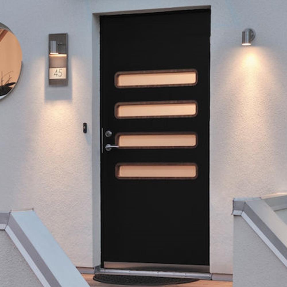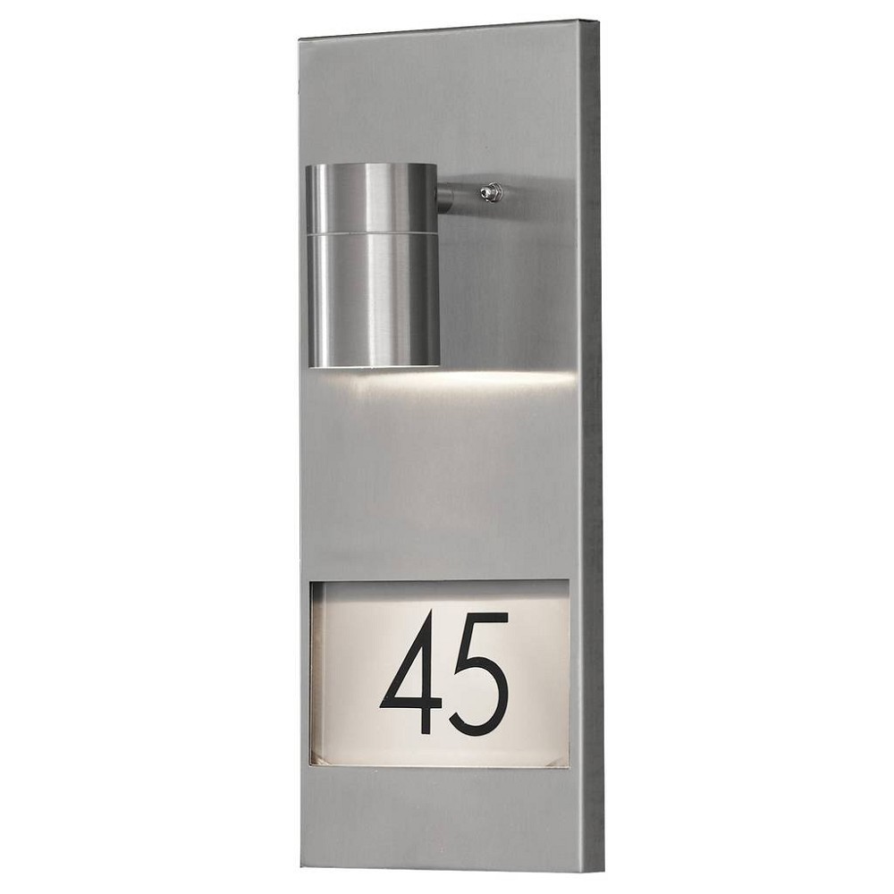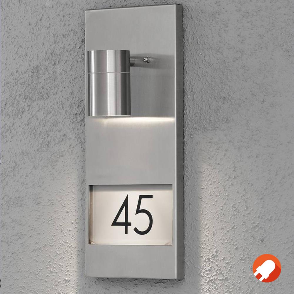 Diese Wandleuchte können Sie selbst anbringen. Sie ist außerdem spritzwassergeschützt und kann auch im Freien in Eingangsbereichen oder an ähnlichen Orten verwendet werden. Ein kleiner Strahler beleuchtet die Ziffern darunter. Die Lieferung erfolgt inklusive Ziffern (3 x 0-9).
