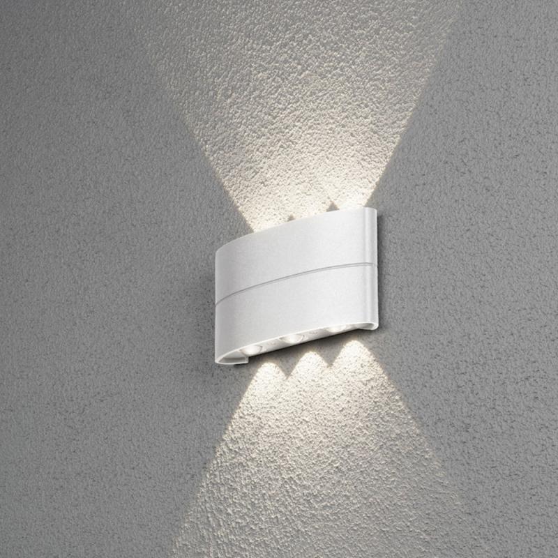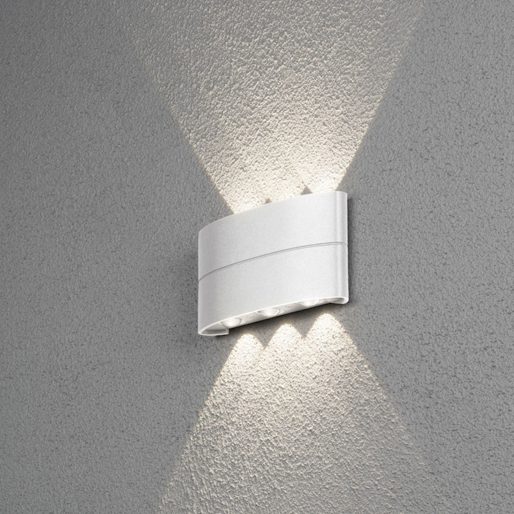 Die LED-Wandleuchte Chieri ist ein echter Hingucker. Gefertigt aus Aluminium und in Form eines abgerundeten Rechtecks sieht sie schon sehr dekorativ aus. An ihrer Oberseite sowie am unteren Rand sind jeweils drei LEDs verbaut, deren warmweißes Strahlungslicht sich oben und unten zu einem großen Lichtkegel verbindet und so die Wand sowie die Umgebung großflächig ausleuchtet.
