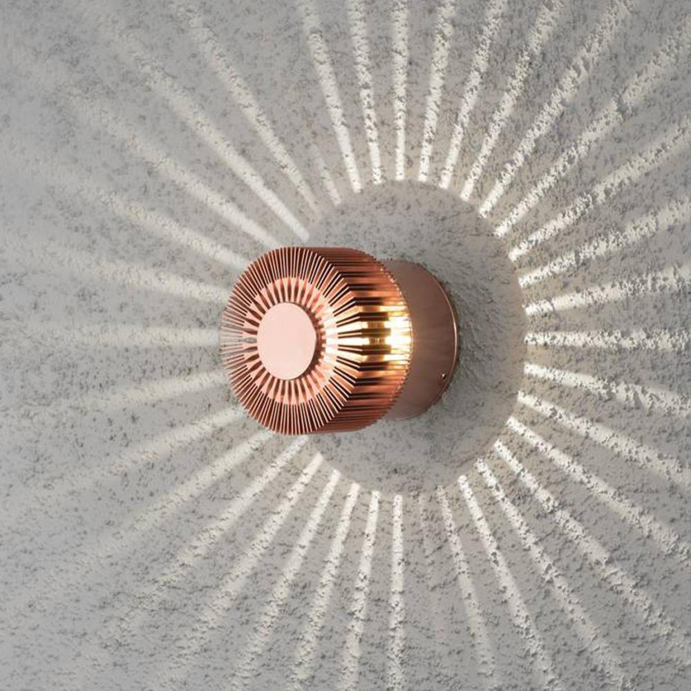 Auf den ersten Blick wirkt sie einfach. Aber wenn Sie sie einschalten, wird sie zum absoluten Blickfang. Das Licht fällt durch die vielen Rillen des Aluminiumkörpers. So entstehen schöne Lichteffekte und eine indirekte Beleuchtung. Die kupferfarbene Eloxierung unterstreicht ihr modisches Design. Die Leuchte ist mit einer leistungsstarken High-Power-LED und der Schutzart IP54 ausgestattet.