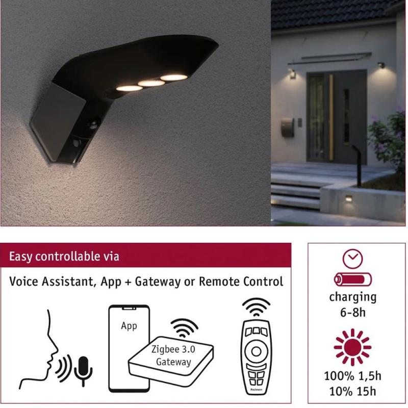 Die Smart Home Zigbee Solarleuchte Soley bringt Licht an die Außenwände. Dank praktischer Solartechnik, ist ein Stromanschluss für die Montage nicht notwendig. Der austauschbare Lithium-Ionen-Akku wird tagsüber durch Sonnenlicht aufgeladen. Damit lässt sich smartes Licht jetzt überall realisieren. Die Leuchte kann via Sprache, App, Fernbedienung oder PIR Sensor gesteuert werden.