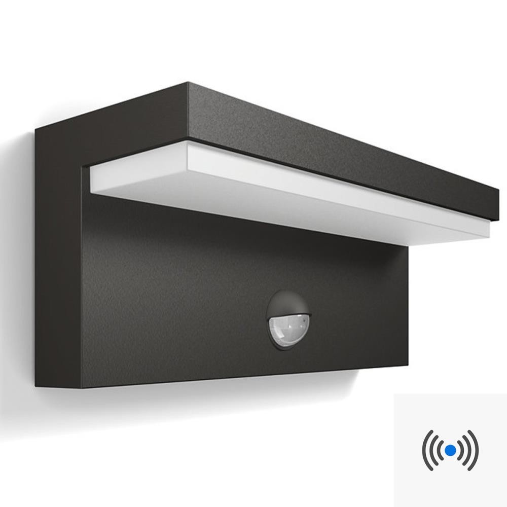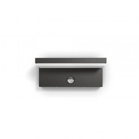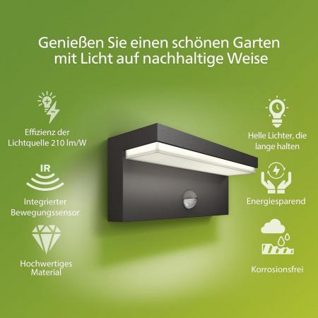 Diese Philips LED-Wandleuchte für den Außenbereich in Anthrazit mit Bewegungsmelder besteht aus widerstandsfähigem Aluminium. Das Design maximiert die Lichtverteilung für ausreichend gestreutes und angenehm warmweißes Licht. Durch die satinierte Glasoberfläche strahlt die Wandleuchte ein blendfreies Licht aus.