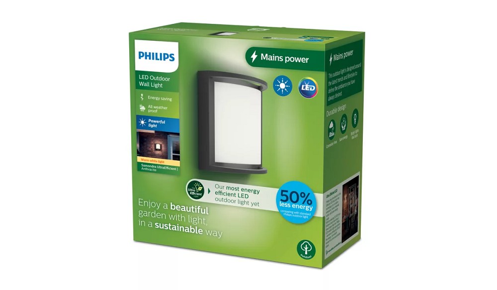 Die Samondra Wandleuchte gehört zu einer neuen Generation besonders nachhaltiger LED-Leuchten. Dank der UltraEfficient-Technologie verbraucht sie bis zu 80 % weniger Energie im Vergleich zu herkömmlichen Lichtlösungen. Mit einer beeindruckenden Lebensdauer von bis zu 50.000 Stunden hält sie mehr als doppelt so lange wie klassische Philips LED-Außenleuchten – das bedeutet weniger Wartung, weniger Austausch und langfristig geringere Kosten.