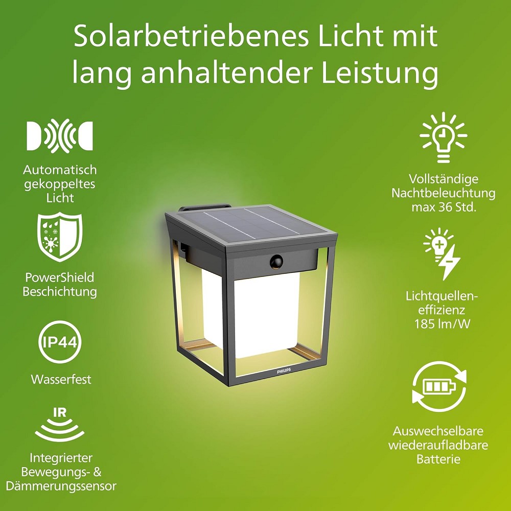 Entdecke die neueste Generation nachhaltiger Außenbeleuchtung: Die ultraeffiziente LED-Solar-Wandleuchte von Philips vereint modernes Design, intelligente Technologie und höchste Umweltfreundlichkeit.
