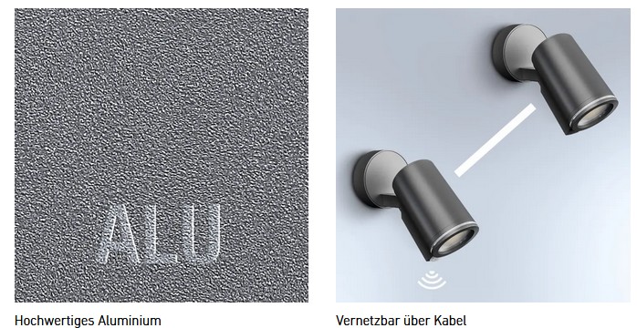 Die Strahler-Serie „Spot ONE“ punktet mit puristischem Design und setzt stilvolle Akzente. Die stabilen Strahlerköpfe sind horizontal (180°) und vertikal (90°) schwenkbar, lassen sich mühelos bedarfsgerecht ausrichten und sorgen mit 520 lm Lichtleistung und warmweißen 3000 K für eine perfekte Ausleuchtung rund ums Haus. Die attraktive Strahler-Serie ist in drei Varianten erhältlich: In der klassischen Sensor-Variante „Spot ONE S“ mit Infrarot-Bewegungsmelder mit 90° Erfassung und 10 m Reichweite. In der Variante „Spot ONE SC“, die mit identischem Sensor ausgerüstet ist, zudem aber eine bequeme und kabellose Einstellung, Vernetzung und Funktionssteuerung per Bluetooth und App ermöglicht. Sowie als Modell „Spot ONE“ ohne Sensor. Das austauschbare GU-10-LED-Leuchtmittel ist jeweils im Lieferumfang enthalten.