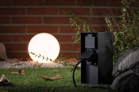 Die Steckdosensäule Rio dient als Stromverteiler für den Außenbereich. Dank IP44 Spritzwasserschutz und Schutzkontaktsteckdosen eignet sie sich perfekt zur Stromversorgung des Gartenlichts.