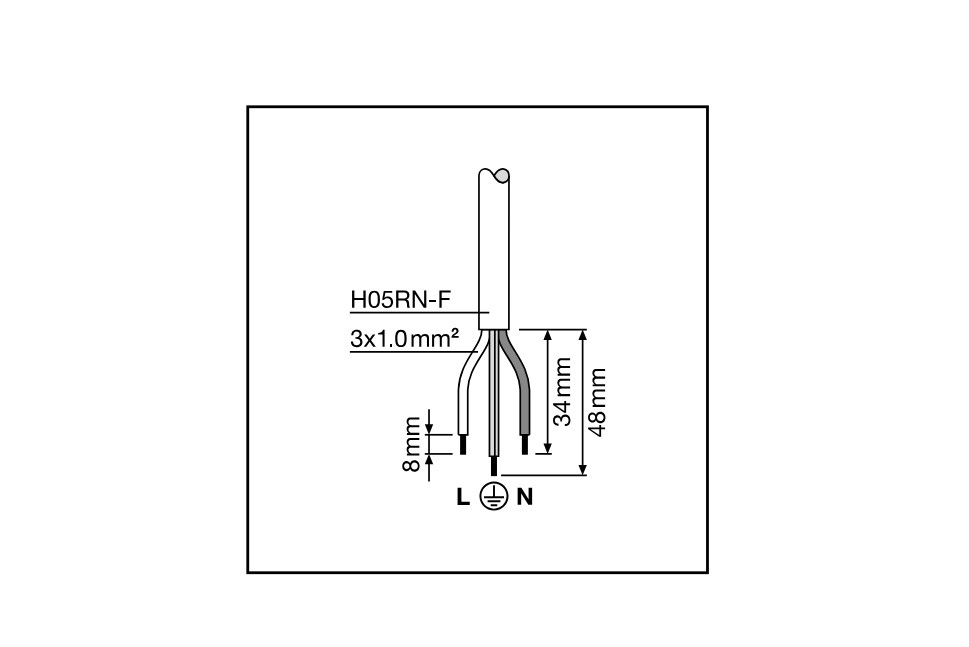 - Vorinstalliertes, flexibles Kabel (H05RN-F) mit 1 m Länge, 3 x 1.0 mm² gekrimpt