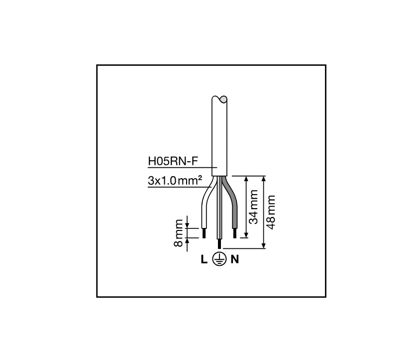 - Vorinstalliertes, flexibles Kabel (H05RN-F) mit 1 m Länge, 3 x 1.0 mm² gekrimpt