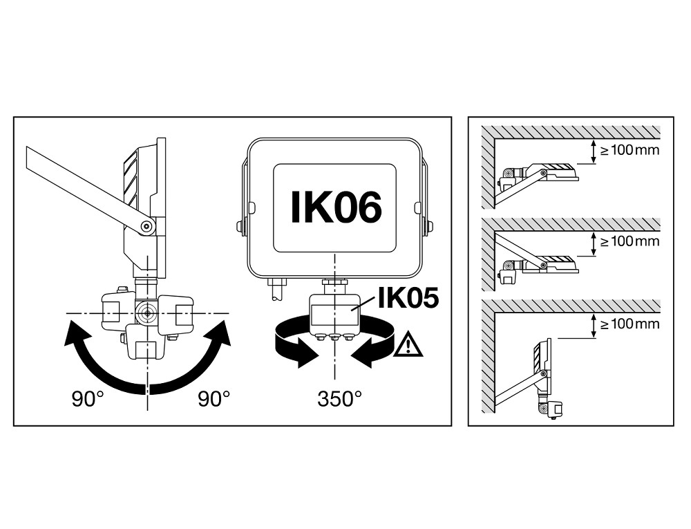 - Reflektorbasierte, symmetrische Lichtverteilung mit 100° x 100° Abstrahlwinkel